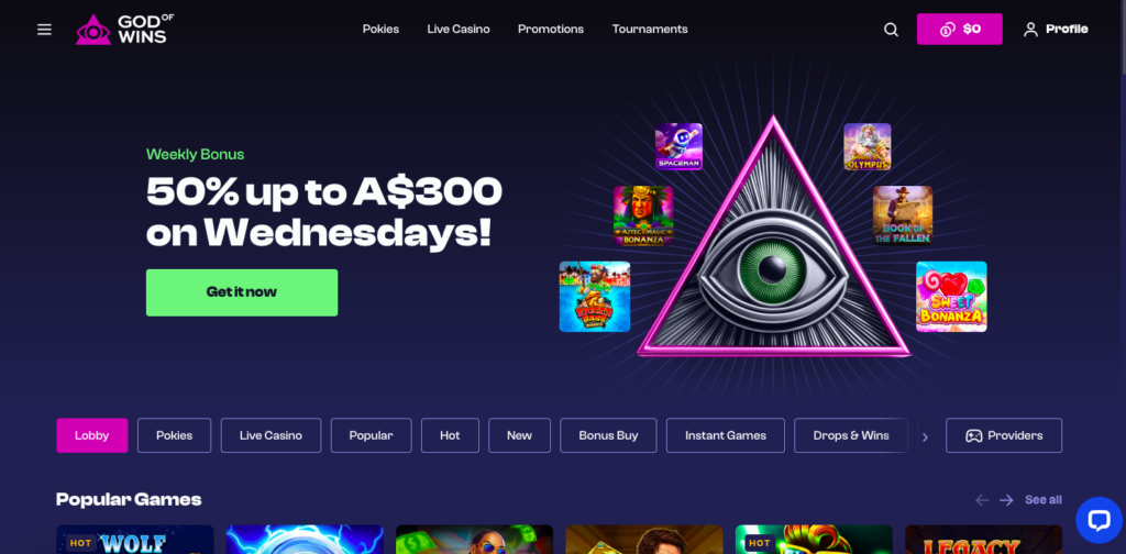 God of Wins is a newly launched online casino that brings a combination of generous promotions, an extensive pokies selection, and a structured loyalty program. The casino has a smooth-operating dark-themed interface, offering an immersive experience for both desktop and mobile users. Players can enjoy over 8,000 pokies, a solid collection of live dealer games, and various exclusive bonuses tailored to different days of the week.
