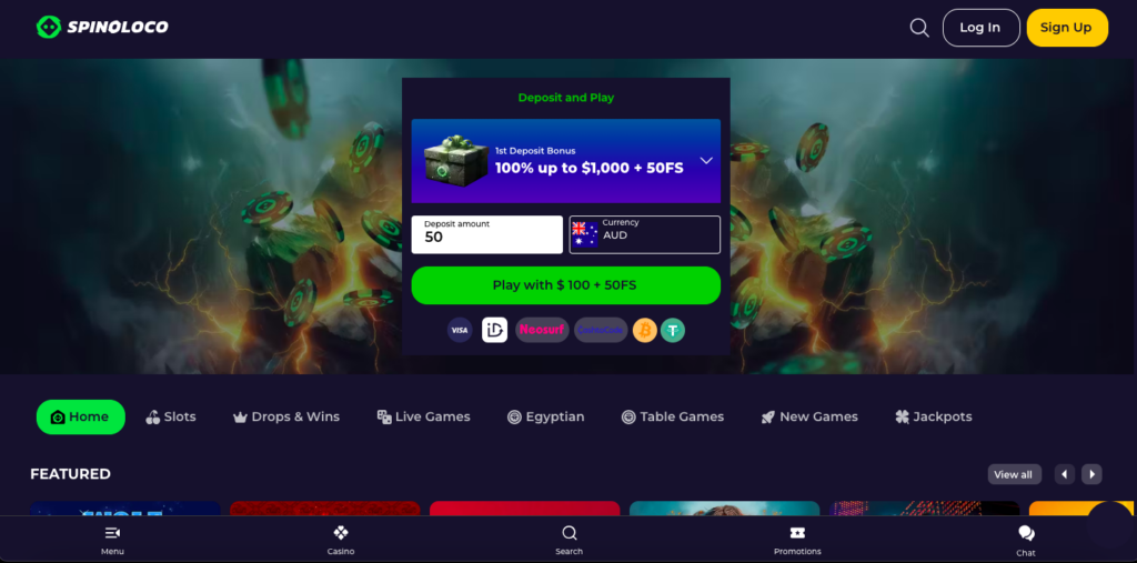 Spinoloco provides an engaging and user-friendly gaming experience, offering a mix of pokies, live dealer games, and rewarding promotions. The casino welcomes new players with a generous package of up to $5,000 and 250 Free Spins, providing a solid starting point for those looking to explore the platform.