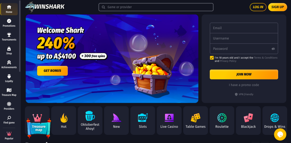 Launched in 2024, Winshark offers an enticing online experience with its inviting colour scheme of dark grey, blue, and gold, creating an environment that players would enjoy spending time in. The user-friendly interface is designed for all types of players, from beginners to experienced gamblers, ensuring that the site is easy to navigate and use without any complications. The promotional section of the page is particularly accessible, making it simple for players to understand the available offers and sign up without hassle.